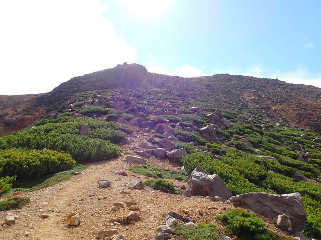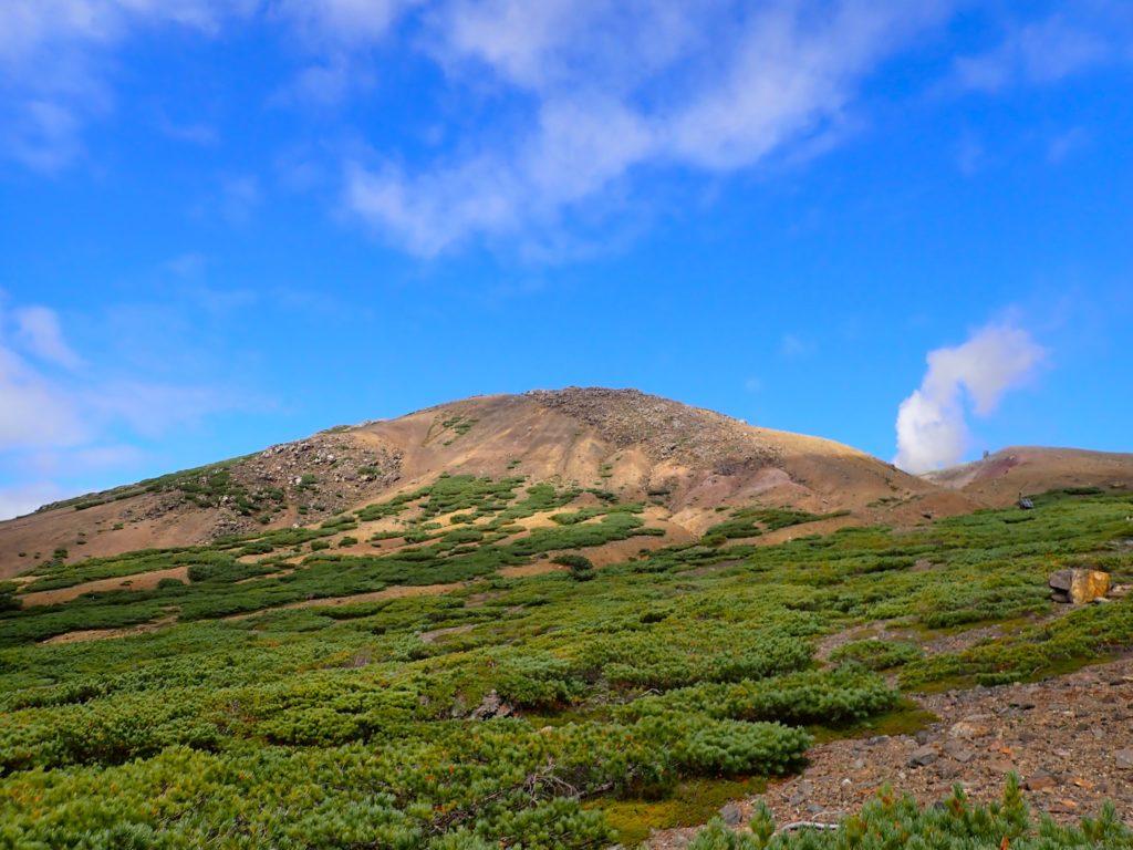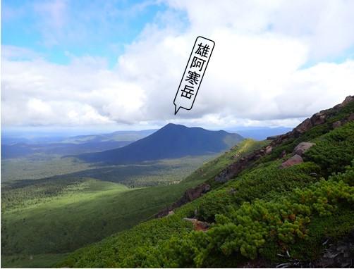 雌阿寒岳から一旦下り、阿寒富士山頂まで急な上り道。阿寒富士山頂から雌阿寒岳を眺める。噴火する前は、大きい山だったに違いないと思った。